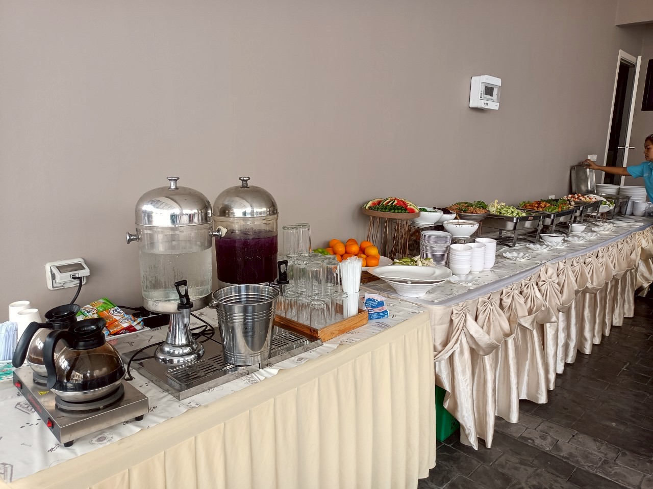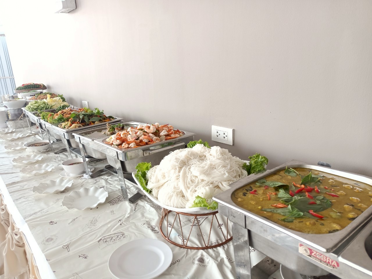 อาหารคาว 5 อย่าง ขนมหวาน 1 อย่าง น้ำสมุนไพร 1 อย่าง ฟรี ชุดCoffee Break (โอวัลติน,กาแฟร้อน,ขนมปังกรอบ) น้ำดื่ม น้ำสมุนไพร ข้าวหอมมะลิ ผลไม้ (เเตงโม,ฝรั่ง)